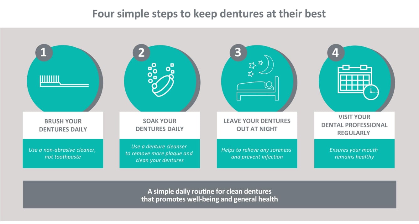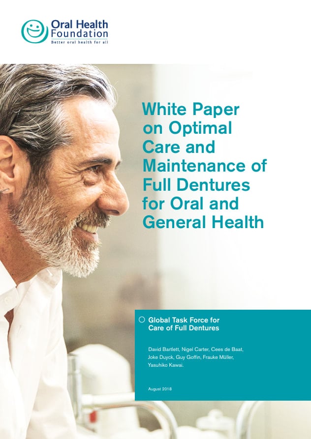 Oral health information A-Z oral health information Denture care guidelines By 2050 there are expected to be two billion people aged 60 or older. This is more than double today’s figure. The older you are, the more likely you are to have lost all, or nearly all, your natural teeth. This means the demand for full or partial dentures is expected to increase. A comprehensive review of scientific and evidence-based research has found contradictory guidance and a lack of consistency in the recommendations for cleaning and maintaining dentures. We have therefore developed global guidelines on optimal denture care, so that correct advice can be given to patients. Key findings The panel explored a number of issues, including; the challenges denture-wearers face, problems with current guidance and the evidence which is available. Here are some of the conclusions: A lack of denture cleanliness can lead to poorer oral health, as well as general health problems. The general cleaning habits of denture-wearers remains poor. People with dentures are using a variety of ways to clean their dentures. This ranges from soap and water to toothpastes, bleaches and commercial products. Recommendations to both dental professionals and denture wearers vary between countries and within a country, and usually rely on personal experience. Also, opinion leaders provide contradictory guidance for cleaning and maintaining dentures. Funding for the development of these guidelines was provided by Haleon to the Oral Health Foundation. No editorial control, apart from ensuring compliance with legal and regulatory considerations/requirements, has been exercised by Haleon Consumer Healthcare. Summary of guidelines The guidelines are supported by best evidence and based on consensus from key international experts. Four key steps to optimal denture care, summarised in the below graphic and available in full here, were concluded: Daily cleaning of the dentures using mechanical action – brushing with a toothbrush or denture brush and an effective, non-abrasive denture cleanser (no dentifrice). Daily soaking in a denture-cleansing solution – this seems to deliver extra chemical breakdown of the remaining plaque and some level of disinfection of the denture. Denture-cleansing solutions should only be used outside the mouth, and denture wearers should strictly follow the manufacturers’ guidelines. Denture wearers should not keep their dentures in the mouth overnight, unless there are specific reasons for keeping them in. This guideline is even more important for people at a higher risk of developing stomatitis and for frail or institutionalised older people. Soaking in a denture cleanser solution after mechanical cleaning seems to be beneficial for preventing denture stomatitis and the potential risk of pneumonia events in these groups of people. All patients who wear removable dentures should be enrolled into a regular recall and maintenance programme with their dental professional. Resources Denture Care Guidelines (pdf 352KB) Denture Care Infographic (pdf 203KB) Useful information Learn more about dentures Q&A on denture cleaning Find out about denture stomatitis Acknowledgments Funding for the development of these guidelines was provided by Haleon to the Oral Health Foundation. No editorial control, apart from ensuring compliance with legal and regulatory considerations/requirements, has been exercised by Haleon Consumer Healthcare. Chat with us, powered by LiveChat Manage Cookie Preferences