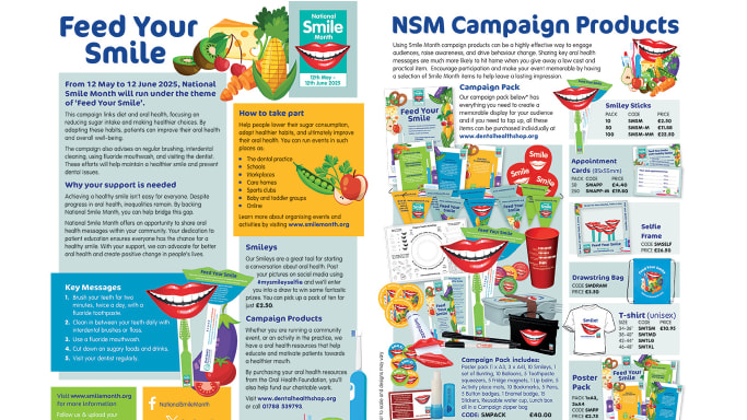 National Smile MonthBetween 12 May and 12 June 2025, the Oral Health Foundation will raise awareness of important oral health issues. Join the nation's biggest oral health campaign and help bring a smile to millions of people. This year the theme for National Smile Month is Feed Your Smile. Find out more Take part About National Smile Month Key messages National Smile Month 2025 Our partners Your oral health Top tips How to clean your teeth Diet and your oral health Oral health & general wellbeing Statistics Feed your smile Diet and a healthy smile Top food tips Smart snacking Hydration and oral health Top dairy foods The gut health link How sugar affects your smile Acidic foods and drinks The worst foods and drinks for your teeth Take part The Smiley Things to do Activities for professionals Activities for schools Fundraising Downloads Shop National Smile Month downloads and resources Poster & Guide 2025 Poster & Guide 2025 Here's our new National Smile Month 2025 campaign guide. Download it and share it with your team for ideas and inspiration to get involved and support this year's National Smile Month. Our guide also has lots of educational resources specially-designed to help raise awareness about the importance of good oral health. Click here to download Create your own National Smile Month images Create your own National Smile Month images For the first time we are giving you the tools to make your own official #SmileMonth images! You can do this for free using Canva. If you do not have a Canva account, you can create one for free. Below are links to all of our official templates. Click on the size you need and you will be taken to the template. X/twitter, LinkedIn, and Facebook Instagram post Instagram story Never used Canva before? Follow our easy step-by-step guide. Show your support online Download our pre-made social media posts to share online and help us spread positive oral health messages even further. Inside these packages are posts about: Brushing your teeth twice a day with fluoride toothpaste Cleaning in between your teeth Cutting down the sugar in your diet Visiting the dentist Using fluoride mouthwash As well as two posts with space to add your own logo to show your business or practice is behind this years campaign! To download these, use the buttons below. X/twitter, LinkedIn, and Facebook) Instagram posts Instagram story Email signatures Show your support for National Smile Month whenever you send an email! Download our custom images for your email signatures by clicking on the image to the left. If that does not work, click here. Digital guides Discover our comprehensive series of digital guides designed to improve your oral health. Whether you’re looking to improve your brushing technique, learn about interdental cleaning, or explore tips for maintaining healthy gums, our guides cover it all. Download them today and take a step toward a brighter, healthier smile! Healthy Mouth, Healthy You This is our latest digital guide, created alongside the wonderful EMS. Oral health and systemic disease Taking care of your oral health is about more than your mouth. Getting children interested in oral health It is not always easy, but it is essential to help your little ones build healthy habits which last a lifetime. Digital Guide to Healthy Gums We teamed up with Corsodyl toothpaste, to give you some great tips for healthier gums. Digital Guide to Better Brushing It’s so simple. Twice daily toothbrushing is the most important thing you can do for your smile Digital Guides to Dental Erosion By learning about the effects of dental erosion, as well as how to spot and manage it, we can make healthier choices. Infographic: Sustainable Oral Health Products We teamed up with TePe to look at some of the most interesting stats when it comes to our toothbrushes, and what they may be doing to our planet. Infographic: Interdental Cleaning Are the UK’s oral health habits really something to smile about? Here’s what our research says about how British adults are caring for their smile. Manage Cookie Preferences