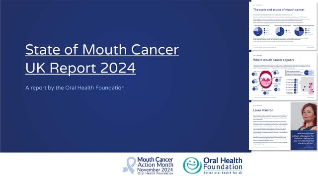 Mouth Cancer Action Month About mouth cancer Mouth Cancer Action Month How to spot mouth cancer Mouth cancer risk factors Living with mouth cancer Mouth cancer statistics The State of Mouth Cancer UK Report 2024 Patient journeys Get involved Blue Ribbon Appeal Blue Wednesday Become an ambassador Sign the mouth cancer charter Support services Downloads Pages The State of Mouth Cancer UK Report 2024 The State of Mouth Cancer UK Report 2024 is the United Kingdom's only comprehensive review into mouth cancer. The report has been released by the Oral Health Foundation, as part of November's Mouth Cancer Action Month. The State of Mouth Cancer UK Report 2024 looks at the very latest statistics for the disease. This includes new incidence figures, survival rates, where the disease is most likely to appear, as well as trends over time. The report also looks into the nation's awareness of mouth cancer and how much is known about the risk factors and signs and symptoms of the disease. Finally, the report covers some key challenges and recommendations for the future. We believe these will have an important impact on the landscape of mouth cancer in the years to come. A summary of the key findings New cases of mouth cancer in the UK reached 10,825 last year. This has increased by 38% in the last decade and by 133% compared with 20 years' ago. 53% of mouth cancers appear on the tongue and tonsils. Last year, 3,637 people in the UK lost their life to mouth cancer. The ten-year survival rate is between 18% and 57%, depending on where the cancer strikes and how early it is diagnosed. Around 77% of UK adults know that it is possible to get cancer in or around the mouth. Awareness on the signs, symptoms and risk factors is poor. Awareness of the major signs and symptoms for mouth cancer are as low as 20%. Awareness on the major risk factors of mouth cancer is as low as 8%. Improving education, increasing access to NHS dentistry and tackling late diagnosis are some of the key challenges in confronting mouth cancer. The report calls for a government-funded mouth cancer campaign. It also urges government to resolve the issues around the NHS dental contract and workforce, as well as offering training to non-dental professionals to help them identify mouth cancer cases sooner. Download State of Mouth Cancer Report 2024 (PDF 1MB) Sharing mouth cancer awareness social media By posting messages on social media, you can help us to raise awareness of mouth cancer. Your posts can engage others and encourage them to find out more information about the disease. It is so important that we learn more about the risk factors, signs and symptoms and where to go if you spot anything out of the ordinary. By doing this, we can prevent some cases from happening and improve early diagnosis rates. Long lasting ulcers, red or white patches and unusual lumps and bumps are three common warning signs of mouth cancer. A simple check takes only 45 seconds and could be life-saving www.mouthcancer.org #MouthCancerAction #Mouthaware The everyday choices we make can affect our chances of developing mouth cancer. Smoking cigarettes significantly increases your risk of developing the disease. Find out what else increase your risk at www.mouthcancer.org #MouthCancerAction #Mouthaware Regular visits to your dental team are so important. Attending appointments as often as they recommend makes it more likely that any problems will be caught as early as possible, including mouth cancer. #MouthCancerAction #Mouthaware Mouth cancer cases are on the rise, but awareness is dangerously low. Take control and learn how to be #mouthaware at www.mouthcancer.org #MouthCancerAction The earlier a problem is caught, the easier it tends to be to tackle. Mouth cancer is no exception. The smaller the affected area, the better the chances are of a full recovery. If in doubt, get checked out! www.mouthcancer.org #MouthCancerAction #Mouthaware Useful links: About Mouth Cancer Action Month The Blue Ribbon Appeal Donate to our Mouth Cancer Appeal Manage Cookie Preferences